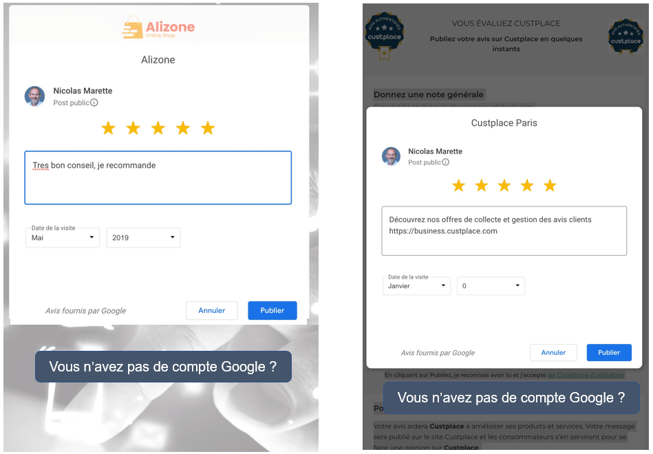 La nouvelle ReviewBox Google permet de solliciter tous les avis Google pour votre entreprise. L’un des avantages de cette fonctionnalité est que les personnes qui n’ont pas de compte Google peuvent quand même laisser un avis en cliquant sur « Je n’ai pas de compte Google ». En effet, toutes les informations nécessaires seront pré-remplies pour déposer un avis sur la plateforme Custplace. Cela vous permettra de ne pas « perdre » ces avis et d’optimiser votre référencement, votre e-réputation et votre satisfaction client.