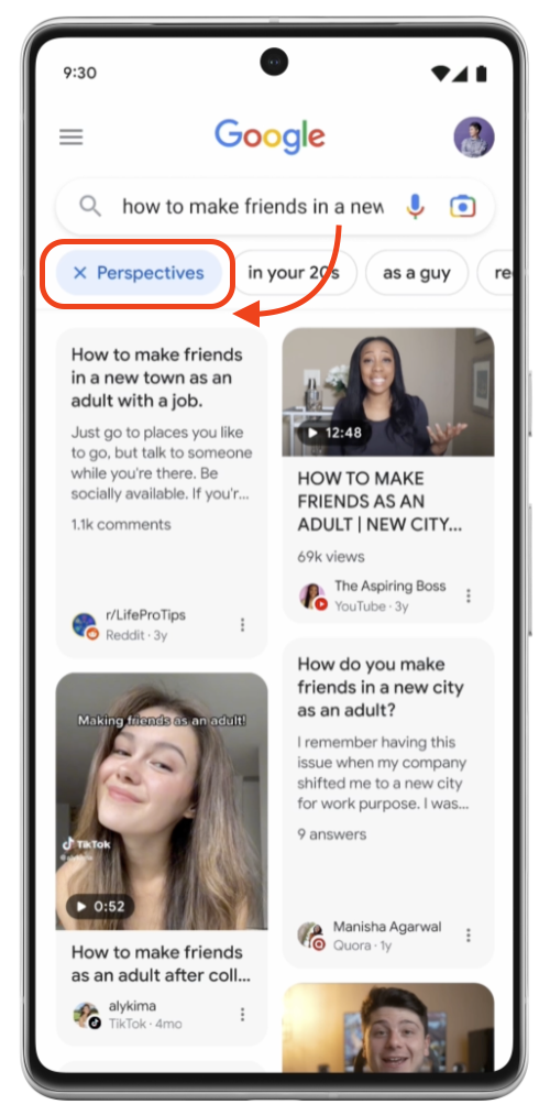 Par exemple, si un utilisateur recherche un prestataire dans une quelconque activité, le filtre Perspectives affichera des résultats contenant des expériences personnelles et des astuces provenant de différentes sources en ligne, telles que les réseaux sociaux, les blogs…