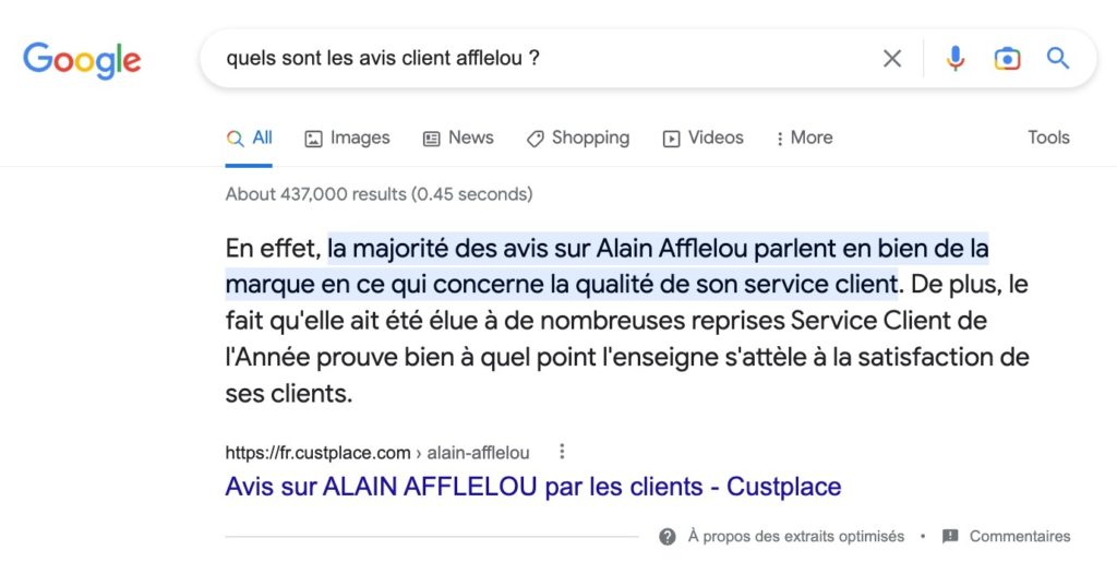 Est-ce que cette fonctionnalité viendrait se baser (ou remplacer ?) les extraits optimisés (appelé « Featured Snippets » ou encore « position 0 » le graal pour les référenceurs) ? Pour rappel, le featured snippet est un aperçu court affiché au dessus des résultats de recherche, mettant en évidence des informations spécifiques extraites d’un site web, telles que des évaluations, des prix, des horaires d’ouverture, des images, des recettes… Les featured snippets permettent aux utilisateurs d’obtenir rapidement des réponses à leurs questions sans avoir à cliquer sur un lien, ce qui améliore l’expérience de recherche.
