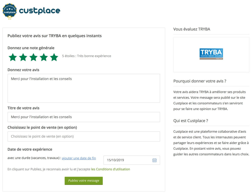 Ci-dessous l’interface de dépôt de l’avis et de la note sur Custplace avec les champs : avis, note, titre, point de vente et date.