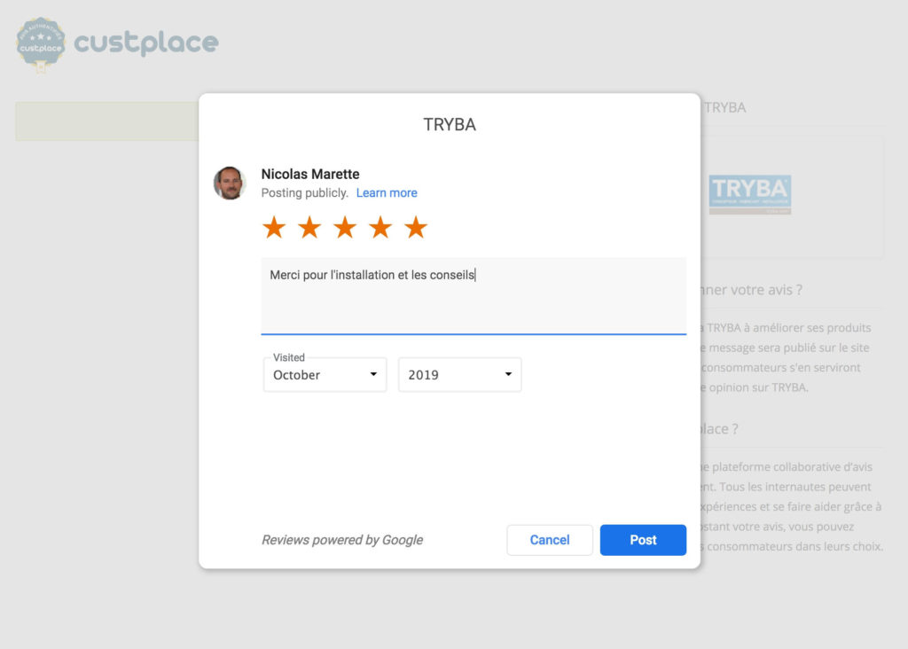 Grâce à cette fenêtre, l’utilisateur n’aura pas à quitter Custplace et redéposer un avis et une note sur GMB, ce qui entretient une expérience utilisateur optimale et constitue un gain considérable de temps.