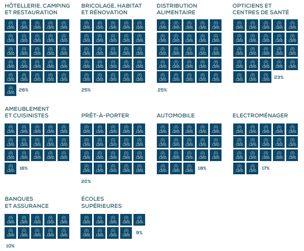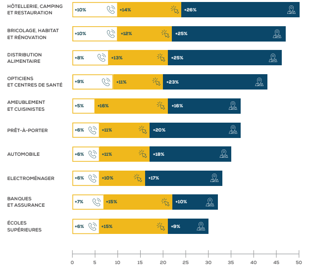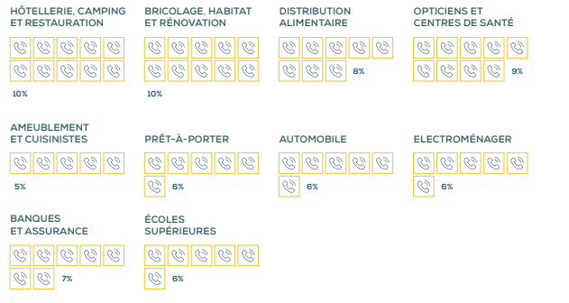 Les secteurs de l’hôtellerie, du camping et de la restauration, des opticiens et des centres de santé génèrent le plus d’appels parce qu’il est généralement nécessaire de prendre rendez-vous, de poser des questions techniques et de demander le prix des prestations avant de se présenter dans un restaurant, un gîte, un cabinet médical ou chez l’opticien du coin.