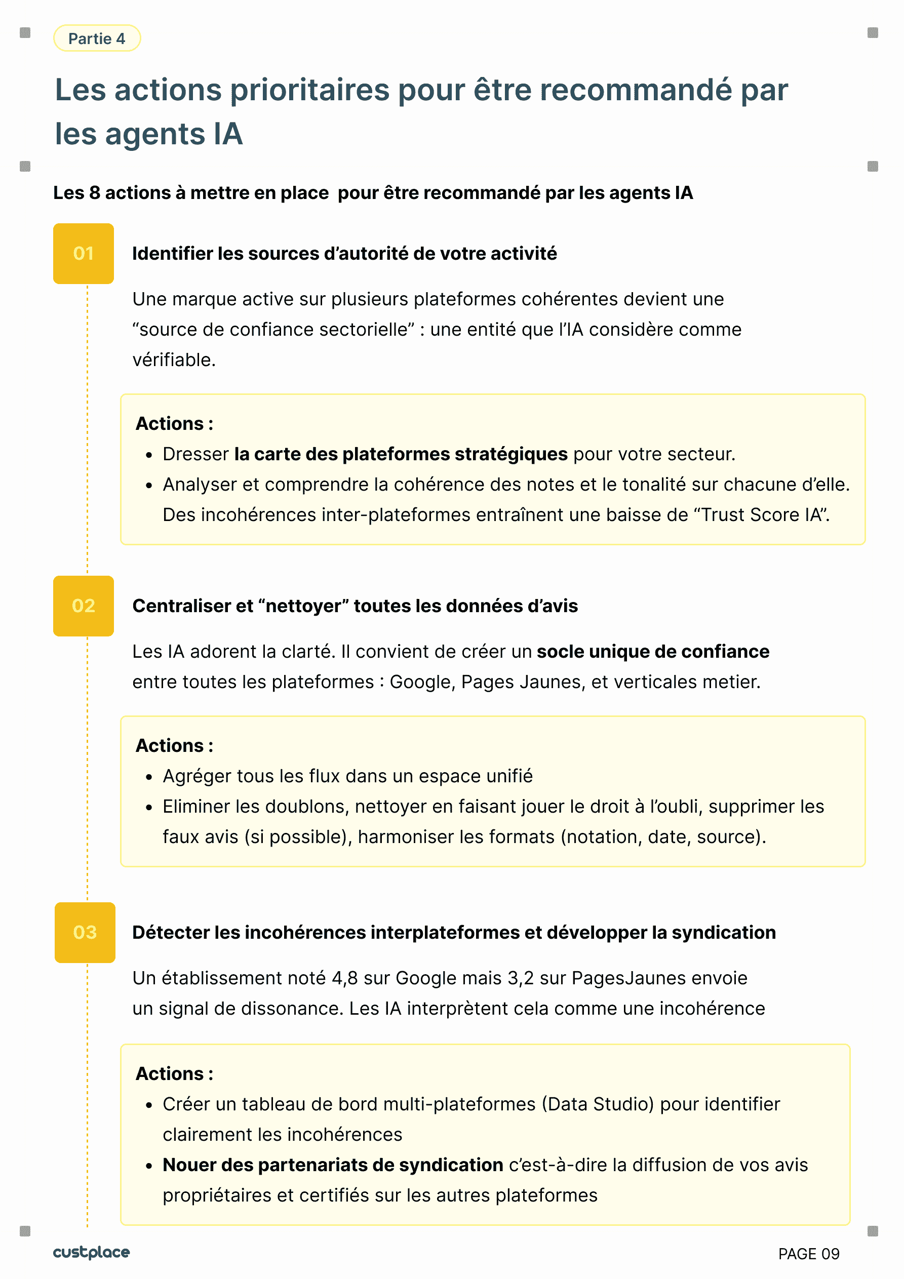 - Check‑list : les 8 actions prioritaires pour être recommandé par les agents IA : Une feuille de route claire pour structurer vos avis, vos données, et maximiser vos chances d’être mis en avant.