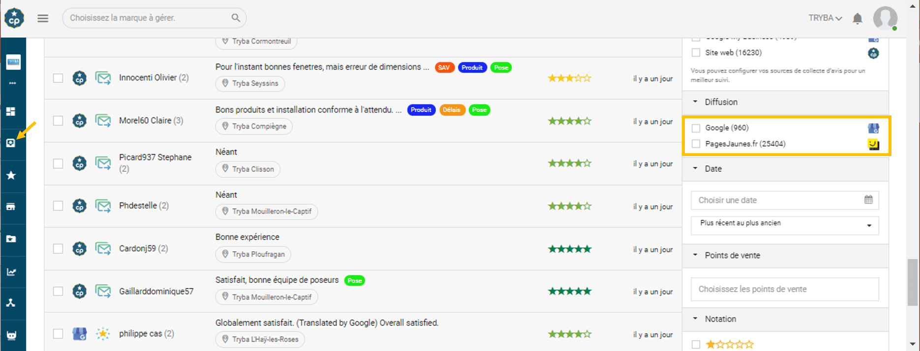 Icônes et sélecteurs filtres de diffusion des avis chez nos partenaires