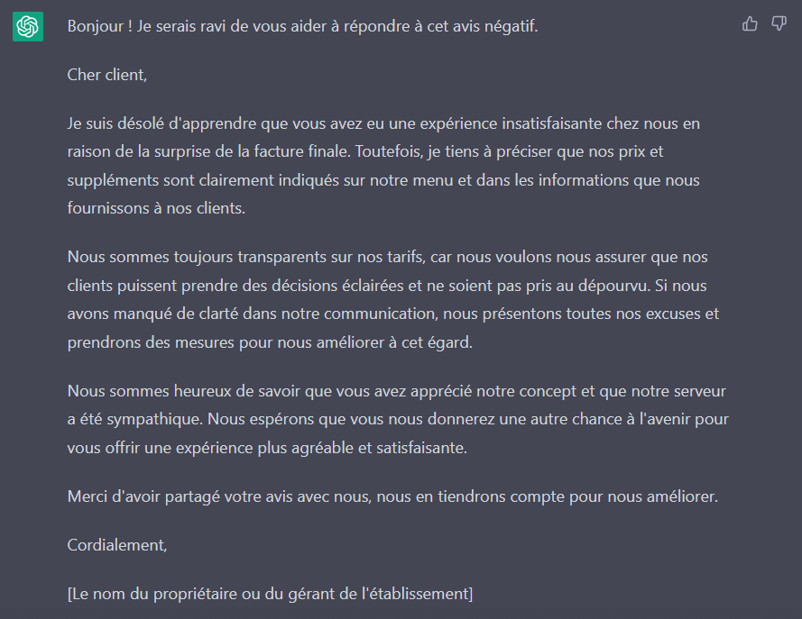 Prototype de réponse par ChatGPT pour vous aider à répondre aux avis négatifs :