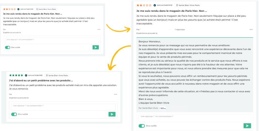 Mesurer l’expérience client localement : Les avis négatifs fournissent des informations importantes pour améliorer l’expérience client ainsi que pour mesurer la performance de vos différents magasins et déterminer les mesures d’amélioration à mettre en place pour augmenter le trafic dans les magasins les moins performants. Mettre en place une stratégie d’avis client va améliorer l’expérience client dans tous vos magasins, renforcer votre image de marque et augmenter la fidélité de vos clients.